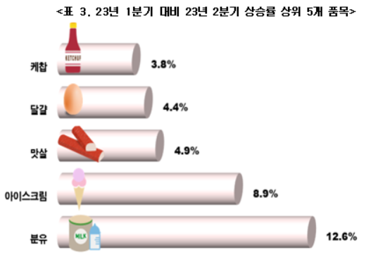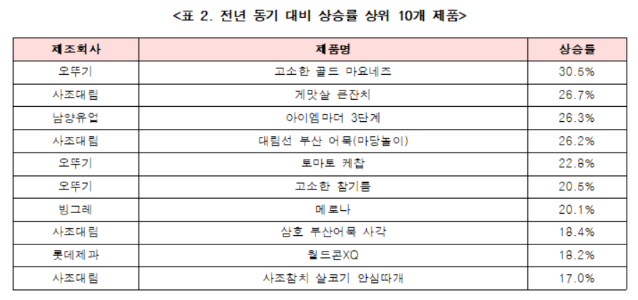 가격 상승률 상위 5개 품목은 마요네즈(30.5%)와 맛살(26.7%), 케첩(22.8%), 어묵(22.0%), 아이스크림(19.2%)이었고, 이들 5개 품목의 가격 평균 상승률은 24.2%로 나타났다.