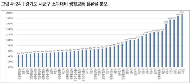 13일 국토연구원의 '지역별 생활교통비용 추정 및 격차 해소 방안'에 따르면 경기도 46개 시·군·구 중 소득 대비 생활교통 점유율이 가장 낮은 곳은 성남시 분당구(4.6%)로 조사됐다.