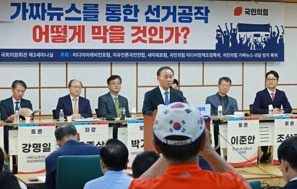 윤재옥 원내대표도 “대한민국 민주주의의 근간을 뒤흔드는 가짜뉴스의 만행이 날로 심해진다”면서 “더 이상 가짜뉴스가 대한민국의 민주주의 영역에 마수를 뻗치지 못하게 강력한 대책이 필요하다”고 강조했다.