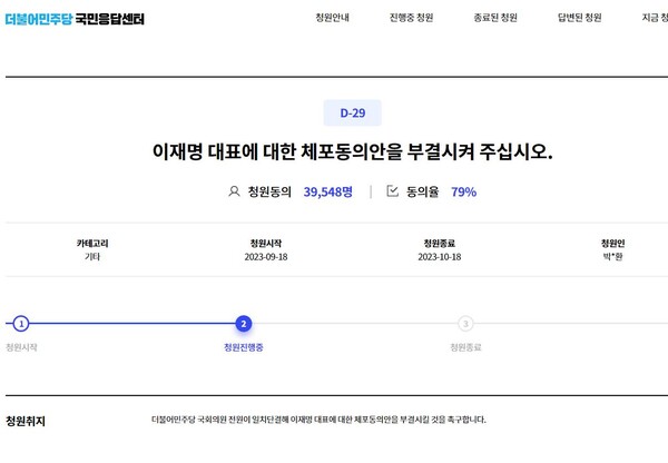 더불어민주당 국민응답센터에는 “이재명 대표에 대한 체포동의안을 부결시켜 주십시오”라는 청원글도 등장했다. 9월 18일 작성된 이 청원글에는 금일 오후 3시 54분 기준 3만9548명이 동의했으며 청원율은 79%에 이른다.