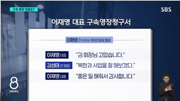 SBS 보도에 따르면 검찰 구속영장 청구서에는 지난 2019년 1월 17일 쌍방울이 스마트팜 사업 비용을 대납하기로 한 직후 이 대표가 “좋은 일 해줘서 감사하다”고 말했다고 적시된 것으로 보도했다.
