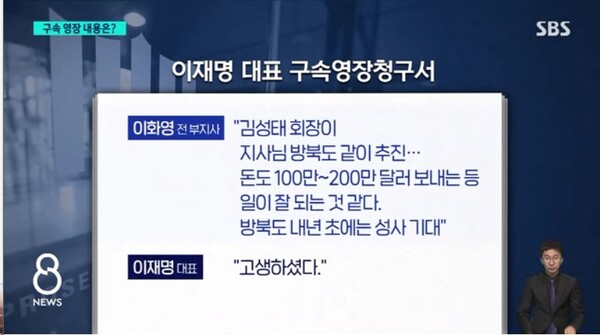 19일 SBS 보도에 따르면 검찰은 구속영장 청구서에 이재명 민주당 대표가 경기도지사 시절 이화영 전 평화부지사로부터 ‘북한 황해도 스마트팜 지원’과 자신의 ‘방북 비용 대납’과 관련 여러 차례 보고를 받았다고 적시했다.