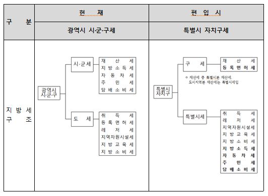 즉, 시군세가 재산세와 지방소득세, 자동차세와 주민세, 담배소비세로 구성되는데 반해 구세가 재산세와 등록면허세로 조정되고, 지방소득세와 자동차세, 주민세와 담배소비세는 특별시세로 이동되는 것이다.