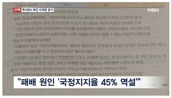 MBN 보도에 따르면 이 대선 백서에는 이재명 대표의 대선 패배 요인으로 문재인 정부의 높았던 ‘지지율’을 꼽았다고 보도했다. 정권교체 여론에 대해 방어를 했어야 했는데, 문재인 정부 당시 지지율이 높아 차별화에 실패했다는 것이다.