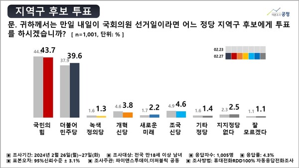 지역구 후보 투표결과에 대해선 “어느 정당 지역구 후보에게 투표할 것이냐는 질문에 대다수 의 사람들은 현재 지지하는 정당의 후보에게 투표할 것이라고 응답하에 정당지지도와 궤를 같이 하고 있다”며 “국민의 힘과 민주당은 오차범위내에서 차이가 없는 것으로 나타나고 있다”고 설명했다.
