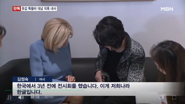 당시 김정숙 여사가 2018년 당시 프랑스를 방문한 김정숙 여사가 마크롱 여사에게 한글 디자인 샤넬 재킷을 직접 소개한 바 있다. 이를 두고 당시 야권에서는 김 여사가 특수활동비로 고가의 옷값을 대납한 것 아니냐는 의혹을 제기했고 이에 대해 청와대는 ‘부인’ 한 바 있다.