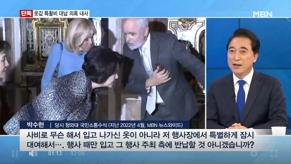 박수현 당시 청와대 국민소통수석은 지난 2022년 4월 ‘MBN 뉴스와이드’에 출연해 “사비로 무슨 해서 입고 나가신 옷이 아니라 저 행사장에서 특별하게 잠시 대여해서…. 행사 때만 입고 그 행사 주최 측에 반납할 것 아니겠습니까?”라고 밝혔다.