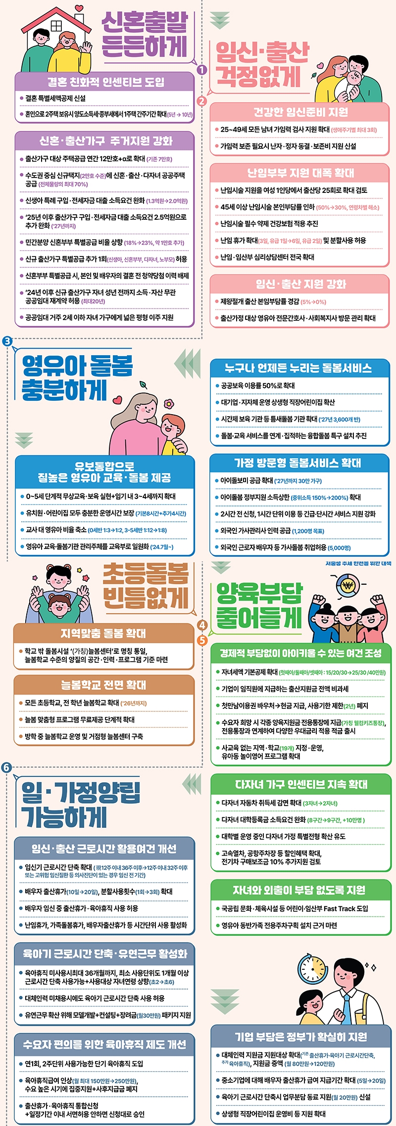 정부는 저출생 대응 방침으로 일‧가정 양립 지원 강화 및 교육‧돌봄‧주거 부담을 획기적으로 줄이는 것에 방점을 두기로 했다.