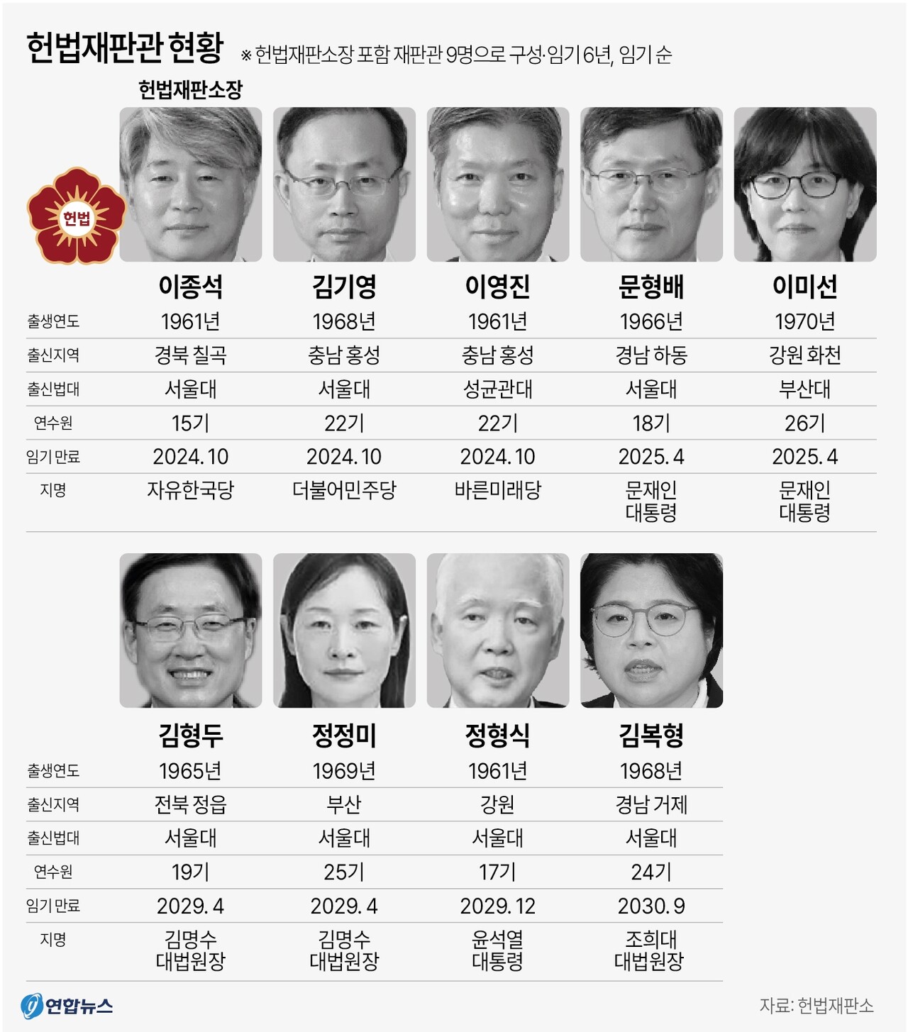 헌재는 9명의 헌법재판관으로 구성되는데, 이종석 헌재소장과 김기영‧이영진 헌법재판관의 임기는 오는 10월까지다. 곧 임기 종료를 앞둔 3명의 헌법재판관은 국회가 추천한 인사로, 따라서 국회가 후임 헌법재판관 3명을 서둘러 추천해야 하지만 국민의힘과 민주당은 추천 방식을 두고 이견을 보이고 있어 헌법재판관 3명이 공석이 되는 헌재 식물 사태가 우려되는 상황이다.