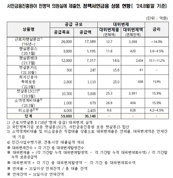 민병덕 의원이 국감 지적에서 15,9%의 금리상품인 최저신용자 특례보증, 햇살로15, 소액생계비대출의 경우 연체율이 26%대로 대출자인 취약계층이 갚을 수 없는 고금리로 채무악순환에서 빠트렸다고 지적하며, 서금원은 민병덕 의원실에 제출에 답변자료에서 서민들이 저축은행 등 제2금융권을 통해 15.9~20%의 금리로 대출받고 있는 상황에서 시장보다 낮은 금리가 서금원 이용자 증가 등 시장왜곡을 발생시킬 우려가 있다고 해 서금원이 본래의 설립 취지를 이해하지 못하는 것 아니야는 질책이다.
