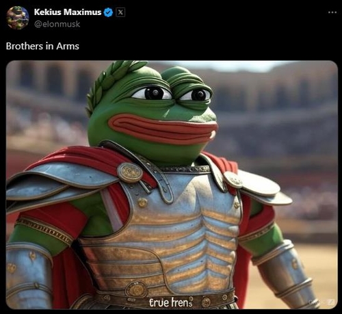 1일(현지시간) 영국 BBC방송 등 외신에 따르면 머스크는 전날 자신의 X 계정 이름을 케키우스 막시무스로 바꾸고, 프로필 사진은 인터넷 커뮤니티에 밈으로 자주 등장하는 ‘개구리 페페’(Pepe the Frog) 캐릭터가 게임 콘솔을 들고 있는 이미지로 변경했다. 별다른 설명은 하지 않았다.