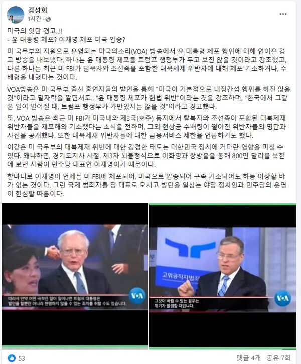 [더퍼블릭=김영덕 기자]김성회 전 다문화비서관이 금일 자신의 SNS에 “미 국무부의 지원으로 운영되는 미국의소리(VOA) 방송에서 윤 대통령 체포 행위에 대해 연이은 경고 방송을 내보냈다”고 주장했다.