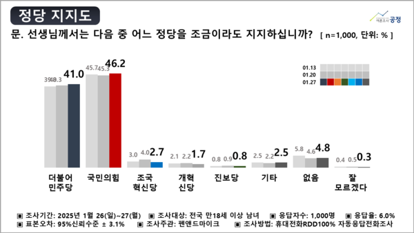 이번 여론조사에서 정당 지지율은 국민의힘은 46.2%, 민주당은 41.0%로 나타났다.
