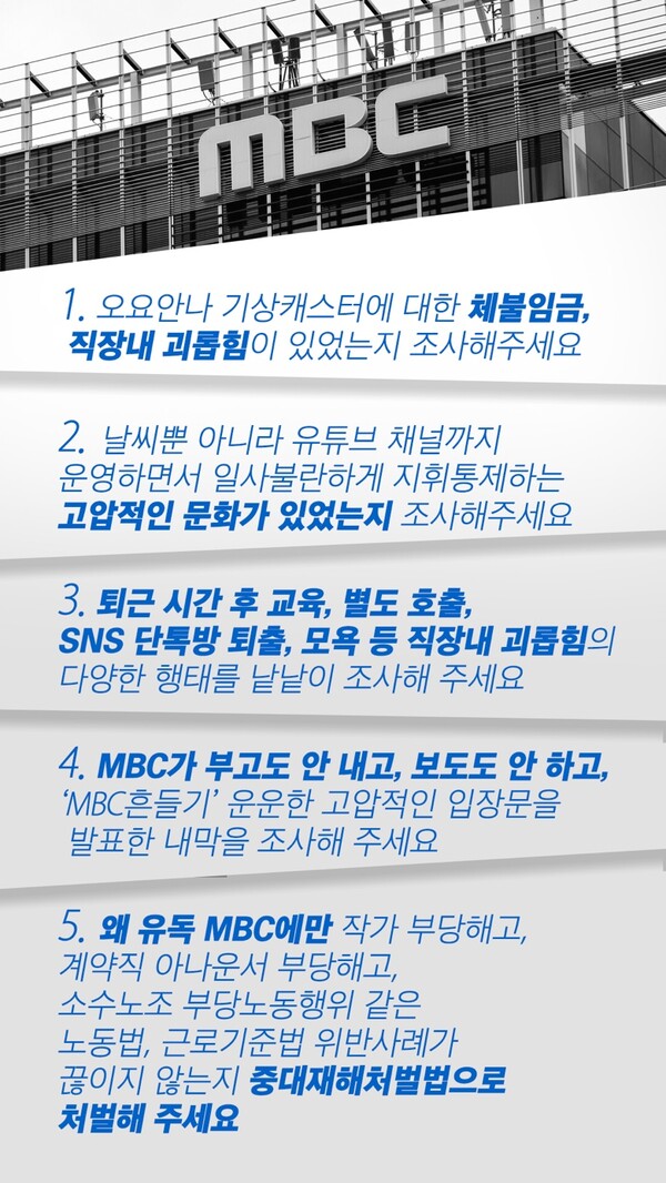 MBC 3노조 측의 오요안나씨의 직장내 괴롭힘 유사 사례와 반복됐던 기상캐스터들의 부당해고 등 MBC가 그동안 자행했던 악행들에 대한 고용노동부의 철저한 조사가 필요한 시점이다.
