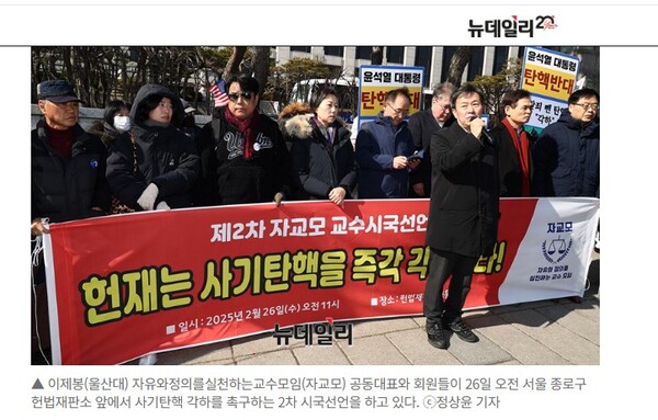 27일 뉴데일리 보도에 따르면 자교모는 26일 오전 서울 종로구 헌법재판소 앞에서 시국선언 집회를 열고 “대통령의 탄핵은 국가 반란 세력들의 합작에 의한 내란이며 윤석열 대통령의 구속 자체는 원천 무효”라고 주장했다.