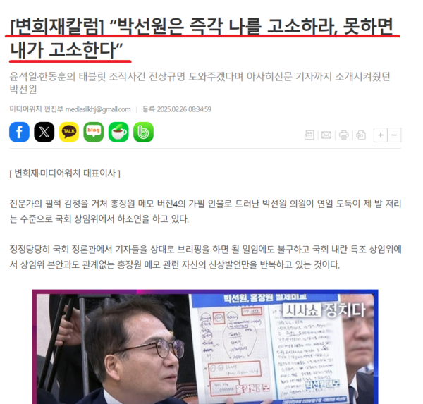 미디어워치 변 대표는 전날(26일)칼럼을 통해 “박선원은 즉각 나를 고소하라, 못하면 내가 고소한다”고 밝혔다. 이는 크게 박 의원이 국정조사특위에서 박 의원이 필적감정 업체의 전문성을 의심한 것과 페이스북에서 변 대표매체를 “극우 음모론 전문매체”라고 언급한 부분을 문제삼는 내용이다.