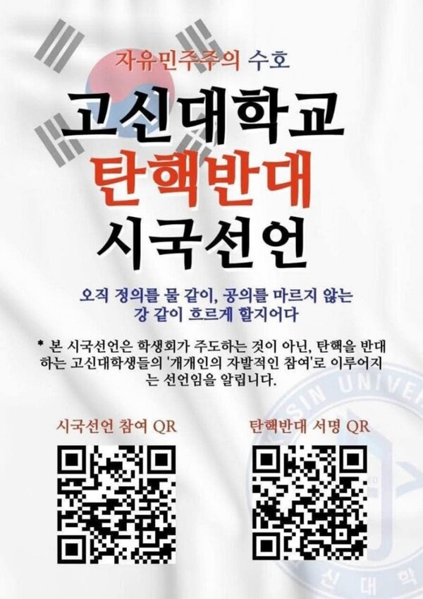 변호인단은 또 “유관순 열사의 모교인 이화여대에서 576명이 넘는 동문들이 탄핵 반대의 목소리를 냈다”며 “4.19혁명의 도화선이 된 대구 학생들의 의거와 이어진 전국 학생들의 시위, 고려대학교의 4.18 선언 또한 지금 탄핵을 반대하는 전국 30여 대학의 시국선언과 다르지 않다”고 설명했다.