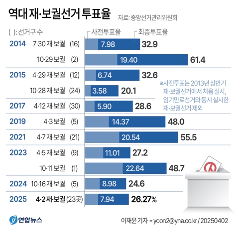 이번 재보선은 서울 구로구청장을 포함해 기초단체장 5곳과 부산시 교육감 등 전국 23곳에서 실시됐다.