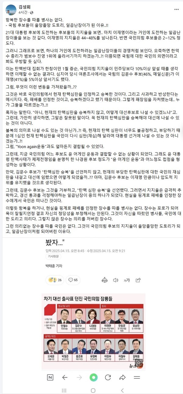 또 “지금 국민의힘 어느 후보도 윤 어게인 운동과 결합할 수 없는 상황이 되었다. 그래도 윤 대통령 탄핵사태가 체제전쟁임을 분명히 한 나경원 후보 정도가 ‘윤 어게인 운동’과 어느 정도 접점을 형성하는 상황”이라고 덧붙였다.