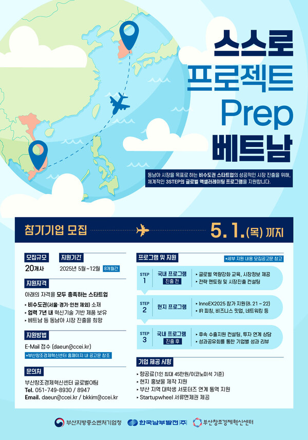 [더퍼블릭=이정우 기자] 한국남부발전(주)(사장 김준동, 이하 ‘남부발전’)은 부산지방중소벤처기업청, 부산창조경제혁신센터와 함께, 내달 1일까지 ‘2025 스스로 프로젝트 Prep 베트남’의 참가 기업을 모집한다.