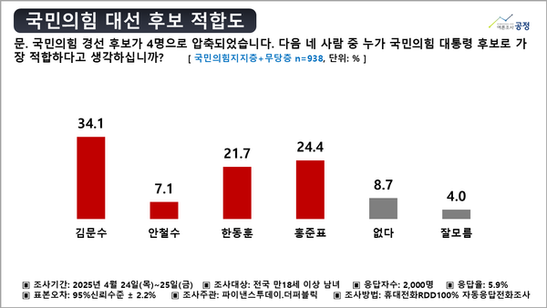 국민의힘지지층과 무당층 938명을 대상으로 진행한 ‘국민의힘 대선 후보 적합도’조사에서는 김문수 후보가 34.1%의 지지도로 오차범위 밖 선두를 기록했다. 이어 홍준표 후보 24.4%, 한동훈 21.7%, 안철수 7.1% 후보가 뒤를 이었고, 없다‧잘모름이란 응답은 8.7%‧4%으로 나왔다.