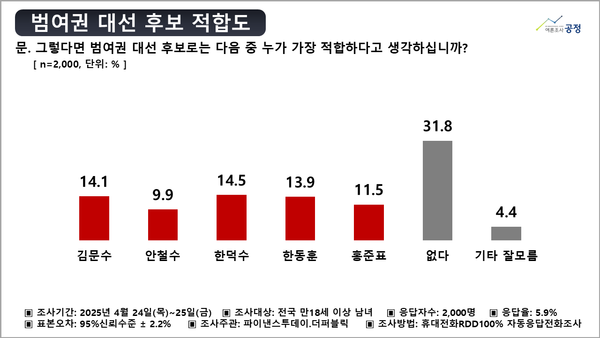 이어 김문수 후보 (14.1%), 한동훈 후보 (13.9%), 홍준표 후보 (11.5%), 안철수 후보(9.9%)가 뒤를 이었다. 없다‧잘모름 응답은 각각 31.8%‧4.4%이다.