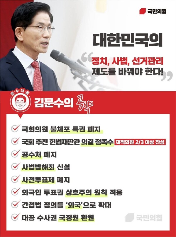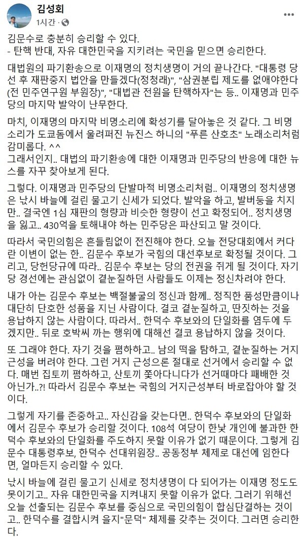 김 전 비서관은 “따라서 국민의힘은 흔들림없이 전진해야 한다”며 “오늘 전당대회에서 커다란 이변이 없는 한 김문수 후보가 국힘의 대선후보로 확정될 것이다. 그리고, 당헌당규에 따라 김문수 후보는 당의 전권을 쥐게 될 것이다. 자기 당 경선에는 관심없이 곁눈질하던 사람들도 이제는 정신차려야 한다”고도 덧붙였다.