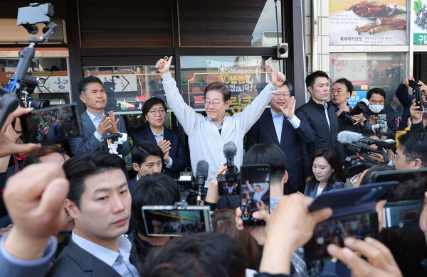 이러한 가운데 그간 당과 ‘선’을 긋던 이재명 대표가 처음으로 이번 파기환송에 대해 거론했다. 6일 충북 증평군의 한 전통시장에서 시민들을 만난 이 후보는 “가끔 불의한 세력의 불의한 기도가 성공하기도 한다”며 “그러나 우리는 결코 지지 않을 것”이라고 말했다.
