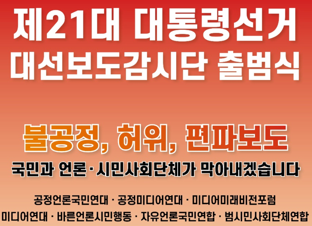 공정언론국민연대·공정미디어연대·미디어미래비전포럼·미디어연대‧바른언론시민행동·자유언론국민연합·범시민사회단체연합 등 언론 관련 시민단체로 구성된 제21대 대선보도감시단은 지난 6일 논평을 내고, 이와 같이 비판했다.