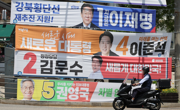 지난 19일부터 전날까지 진행된 전국지표조사(NBS) 여론조사를 보면 이재명 후보는 46%, 김문수 후보는 32%, 이준석 후보는 10%의 지지율로 집계됐다. 지난 12~14일 이뤄진 NBS 조사와 견줘 이재명 후보는 3%포인트(p) 하락했고, 김문수·이준석 후보는 5%p와 3%p 상승했다.