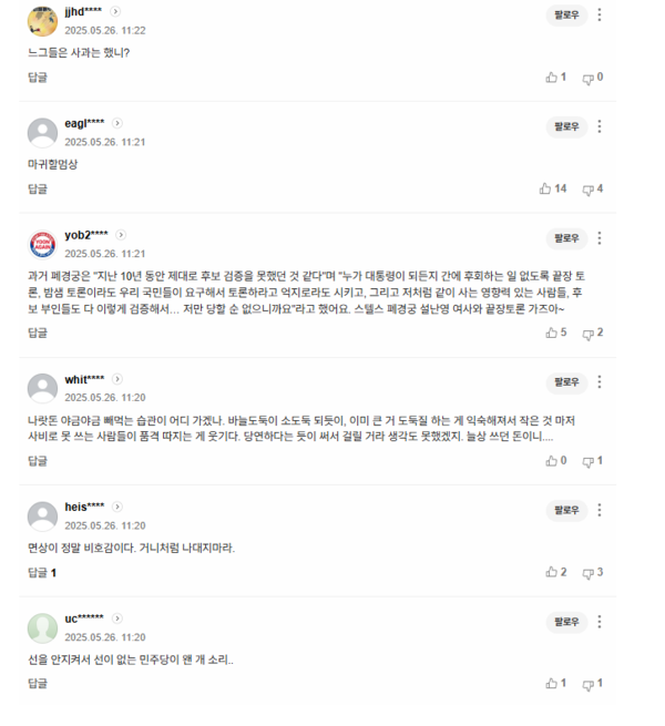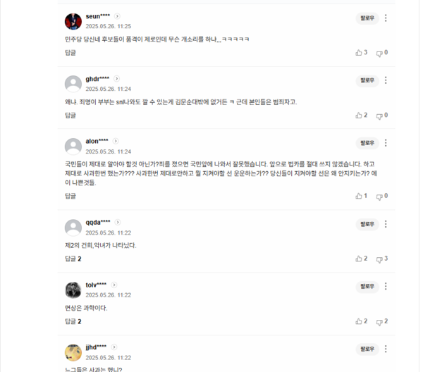 한편, 민주당의 이같은 반응에 네티즌들은 대체적으로 민주당의 대응이 부적절하다는 취지의 입장이 나온다. 11시28분 기준으로 현재 MBN보도에서는 “민주당 당신네 후보들이 품격이 제로인데 무슨 개소리 하냐,,,ㅋㅋㅋㅋㅋ”,“왜냐. 죄명이 부부는 snl나와도 깔 수 있는게 김문순대밖에 없거든 ㅋ 근데 본인들은 범죄자고”,“국민들이 제대로 알아야 할것 아닌가?죄를 졌으면 국민앞에 나와서 잘못했습니다. 앞으로 법카를 절대 쓰지 않겠습니다. 하고 제대로 사과한번 했는가??? 사과한번 제대로안하고 뭘 지켜야할 선 운운하는가?? 당신들이 지켜야할 선은 왜 안지키는가? 에이 나쁜것들.” 등의 반응을 나타냈다.