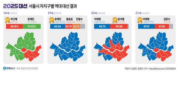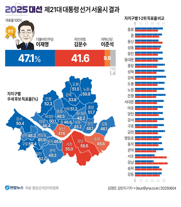 5일 조선일보 보도에 따르면 지역별 이 대통령과 김문수 후보의 득표율을 보면, 마포(48.4%·39.1%) 용산(41.1%·47.6%) 중(46.8%·42%) 성동(45.2%·43.1%) 광진(48.1%·39.9%) 양천(48.3%·41.3%) 영등포(46%·41.6%) 동작(47%·41%) 등으로 나타났다.