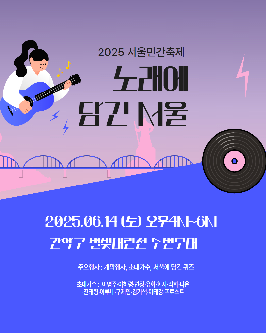 서울시가 후원하고 (주)방송문화미디어텍이 주관·주최하는 추억의 서울 가요축제인 ‘노래에 담긴 서울’이 오는 14일(토요일) 16시에서 18시까지 관악구 신림동 도림천 수변 무대에서 열린다.