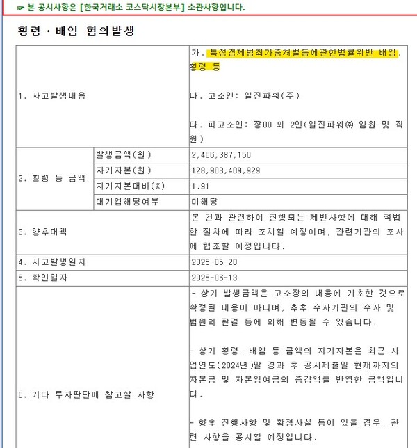 앞서 지난 13일 코스닥시장 상장사 일진파워에서 횡령 범죄가 발생해 이 회사의 주권 거래가 정지됐다.