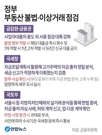 국토부는 서울시 등 지자체, 한국부동산원과 합동으로 편법증여, 업·다운계약, 자금출처 의심사례, 불법전매, 편법·불법 대출 등을 집중점검한다. 위법사항이 확인되면 관계기관에 통보하고 경찰에 수사 의뢰까지 한다는 계획이다.