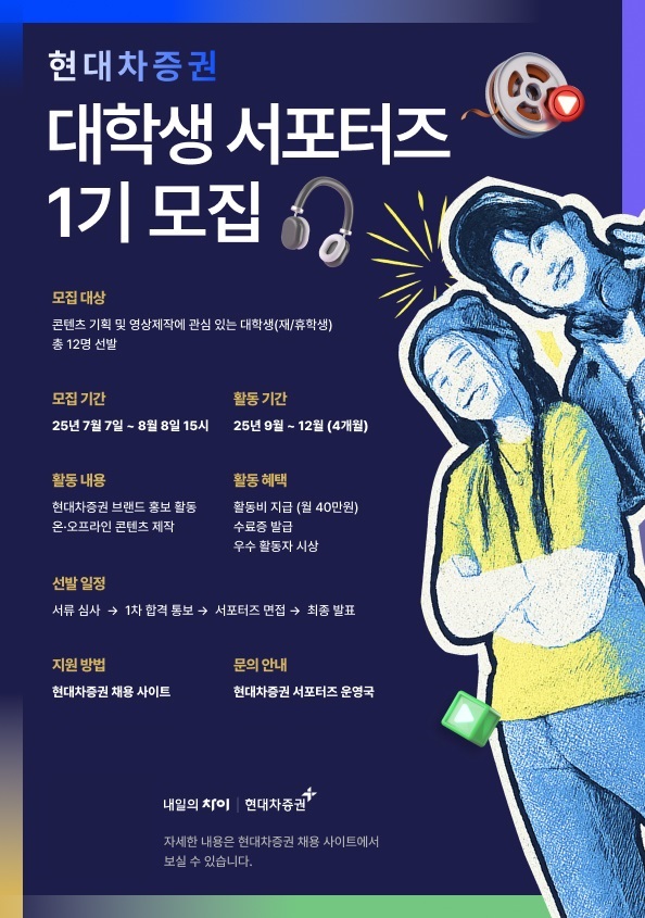 선발된 서포터즈는 9월 3일 발대식을 시작으로 12월 10일 해단식까지 약 4개월 동안 현대차증권의 브랜드 홍보와 온오프라인 콘텐츠 제작에 참여하게 된다.
