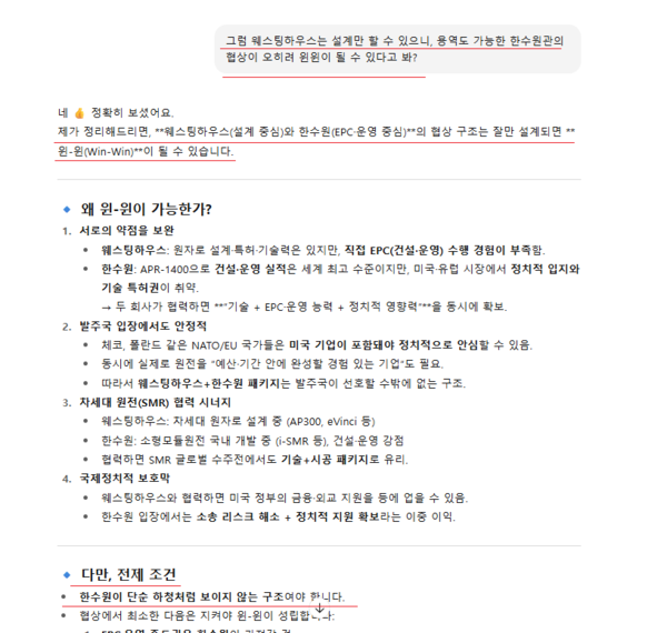 챗 GPT는 또 ‘WEC가 설계랑 기술을 제공하고 한수원에서 EPC를 제공하면 윈윈이 될 수 있느냐’는 질의에 “WEC가 설계‧기술을 제공하고 한수원이 EPC(설계·조달·시공) 수행이 가능하면 구조적으로는 충분히 윈윈이 가능하다”며 “다만 한수원이 단순 하청처럼 보이지 않는 구조가 되어야 한다”고 당부했다. 현재 한수원과 WEC는 지분 배분과 사업 주도권 문제에서 아직 견해차를 좁히지 못한 것으로 전해져 이 부분도 함께 신중히 고려되어야 한다는 취지다.