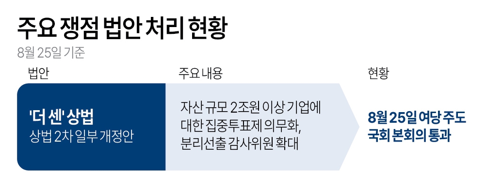 이날 국회 본회의를 통과한 2차 상법 개정안은 자산 2조원 이상 상장사에 대해 집중투표제 도입을 의무화하고, 감사위원 분리 선출을 기존 1명에서 2명 이상으로 확대하는 내용을 골자로 한다.