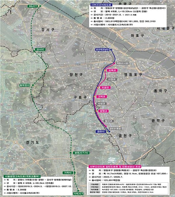 이 공사는 서부간선도로 양평동(목동교)부터 가산동(금천교)까지 총 8.1㎞ 구간에 보도와 녹지 공간을 조성하는 내용이다. 서부간선도로로 인해 단절된 지역을 연결하고 보행자 중심의 안전한 도로 환경을 조성해 지역 주민의 생활환경을 개선하는 것이 사업 목적이다.