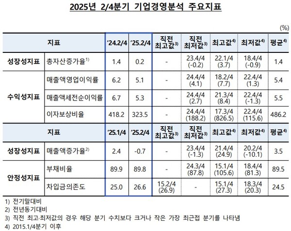 한국은행이 10일 발표한 ‘2025년 2분기 기업경영분석 결과’에 따르면, 외부감사 대상 법인기업 2만6천67개(제조업 1만2천962개·비제조업 1만3천105개)의 2분기 매출은 작년 같은 기간보다 0.7% 줄었다. 올해 1분기 2.4% 증가에서 감소로 전환했다.
