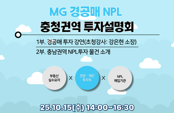 [더퍼블릭=조두희 기자]새마을금고 자회사 MG신용정보는 다음 달 15일 새마을금고중앙회 대전세종충남지역본부에서 개인투자자 및 기관투자자 등 120명을 대상으로 ‘2025년 경·공매 NPL 충청권역 투자설명회’를 개최한다고 밝혔다.