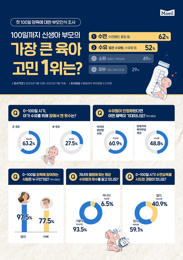조사 결과에 따르면 신생아 건강 관리의 첫 시작으로 골든타임이라 부르는 생후 0~100일 아기를 키우는 부모들의 가장 큰 육아 고민은 불규칙한 수면(62%)과 수유 문제(52.3%)였다.