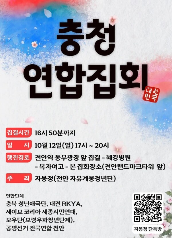 대전에서의 체제 충돌 예고에 이어, 다음 날인 10월 12일(일)에는 충청 지역 우파 및 청년 단체가 연합하여 천안에서 대규모 행진과 집회를 이어간다. 천안 자몽청, 충북 청년애국단, 대전 RKYA, 세이브코리아 세종시민연대, 보우단 (보령우파청년단체) 등으로 구성된 충청연합은 17시부터 20시까지 (16:50까지 집결) 천안 도심을 가로지르며 '조국 수호'의 목소리를 높일 계획이다.