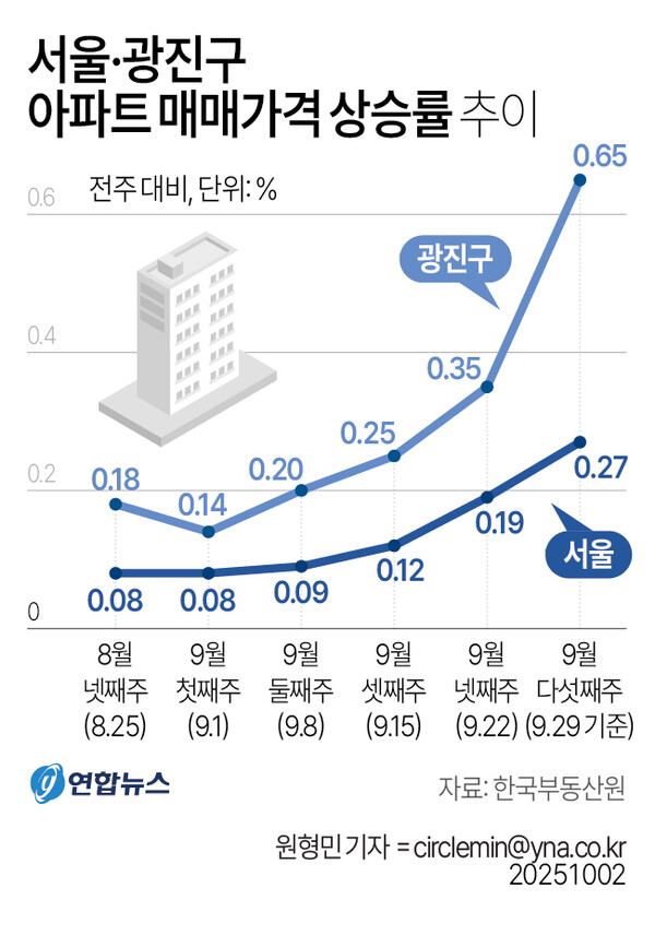부동산원 주간 동향 기준으로 6월 30일부터 9월 29일까지 최근 3개월간 아파트 매매가격 상승률을 보면 서울 성동구(5.01%), 경기 성남 분당구(4.99%), 경기 과천시(3.81%), 서울 광진구(3.57%), 서울 마포구(3.17%), 서울 양천구(2.88%) 등 비규제지역이 상위권에 올라 있다.