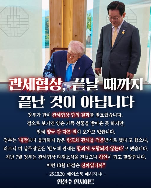 안 의원은 "7월에 속이고, 10월에 또 속이는 행각이 반복되어서는 안 되지 않겠느냐"며 정부의 투명한 협상 과정 공개를 거듭 촉구했다.