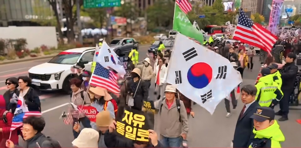 행사의 마지막 순서로는 광화문에서 종각–을지로–서울시청–대한문을 잇는 도심 행진이 이어졌다. 참가자들은 차량 행렬과 함께 태극기를 흔들며 “국정농단의 책임을 물어야 한다”, “진짜 민심은 여기 있다”는 구호를 외쳤다.