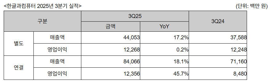 [더퍼블릭=김영일 기자] 한글과컴퓨터(한컴)가 AI(인공지능) 중심의 비즈니스 전환 성과가 가시화되면서 올 3분기 연결 재무제표 및 별도 재무제표 모두에서 견조한 두 자릿수 성장을 달성했다.