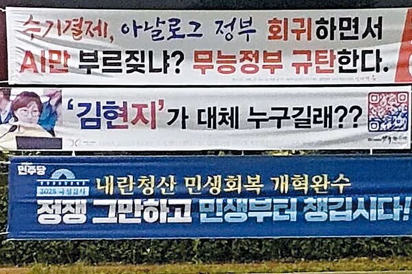 이 대통령의 발언은 최근 전국 곳곳에 내걸린 ‘반중’ 또는 김현지 대통령실 제1부속실장 의혹 관련 현수막을 정조준한 것으로 풀이된다. 일부 군소 정당이 “이재명 정권, 중국에 굴복 말라” “김현지 실장 의혹 진상 공개하라” 등의 문구를 내건 직후였다.