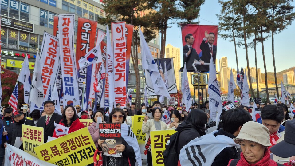 [더퍼블릭=정진철 기자] 지난 16일 세종시에서 제7회 충청연합 애국 집회가 열려, 수많은 애국 시민들이 모여 '자유 대한민국' 수호를 위한 결의를 다지고 거리 행진을 진행했다. 이번 집회는 대전DPYU, 충북청년애국단, 천안 자몽청, 보령 보우단, FLD, 애국키링단, 민초결사대, 피켓단, 호남우파친구들 등이 참여했고, '세이브 코리아' 세종 대표와 국민의힘 소속 인사들의 연설, 그리고 충청권 각 지역에서 모인 시민들의 뜨거운 외침으로 채워졌다.