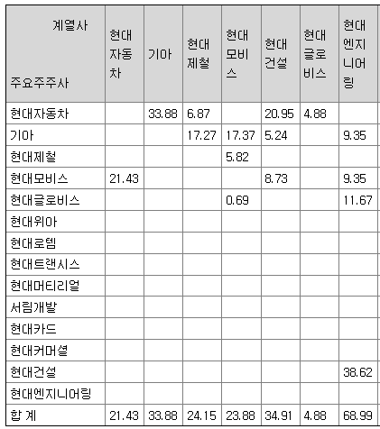 금융감독원 전자공시에 따르면, 현대차의 최대 주주인 현대모비스는 현대차의 최대 주주로 지분 21.4%를 갖고 있으며, 현대차는 기아 지분 33.9%, 현대제철과 현대글로비스 지분 6.9%와 4.9%를 보유하고 있다. 기아 역시 현대모비스 지분 17.4%, 현대제철 17.3%를 소유하고 있다. 현대제철과 현대글로비스는 각각 현대모비스 지분 5.8%, 0.7%를 갖고 있다.